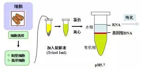 當加入氯仿時,它可抽提酸性的苯酚,而酸性苯酚可促使RNA進入水相,離心后可形成水相層和有機層,這樣RNA與仍留在有機相中的蛋白質和DNA分離開。