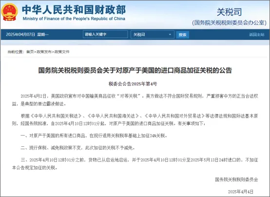 由于關稅的調整,導致美國進口貨物的成本大幅度上漲34%。