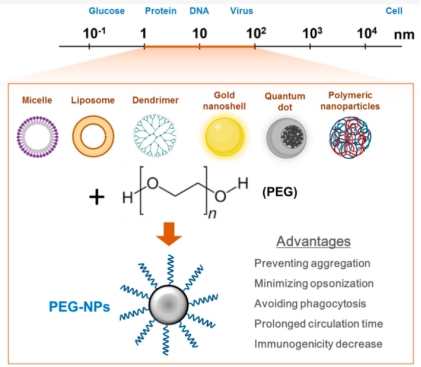 聚乙二醇(PEG)常與尺寸為 1-100 nm(與蛋白質、病毒和 DNA 等天然納米結構相當)的合成納米顆粒(NP)表面偶聯,形成的 PEG-NP 在藥物遞送系統中具備諸多有利特性。