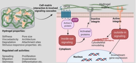聚乙二醇(PEG)基水凝膠作為可調控的三維網絡結構,通過其可變的理化性質(如交聯方式)介導細胞與基質的相互作用,提供動態微環境,而化學交聯(如共價鍵)增強機械穩定性,從而觸發信號級聯,調控細胞粘附、遷移及分化等行為。