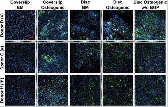 圖:人骨髓間充質干細胞的骨細胞礦化熒光共聚焦圖像拍攝于第28天,比例尺:200微米【1】