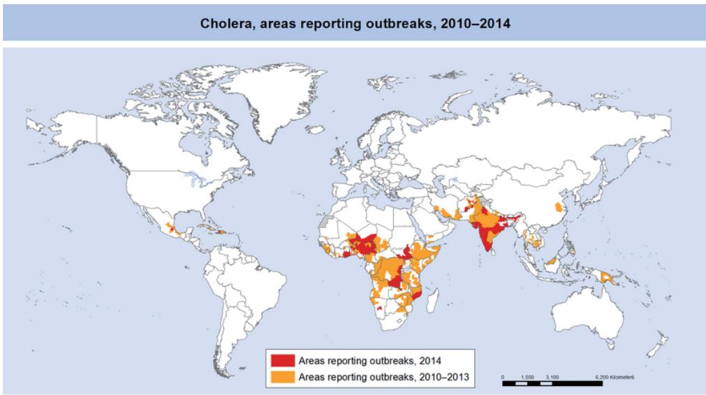 各型弧菌產生類似的腸毒素,臨床表現也類似。每一 次霍亂流行都會有一個特定的優勢型,且流行趨勢是在不斷變化的。根據世界衛生組織的報告,2010年至2014年全球霍亂爆發區域見圖。