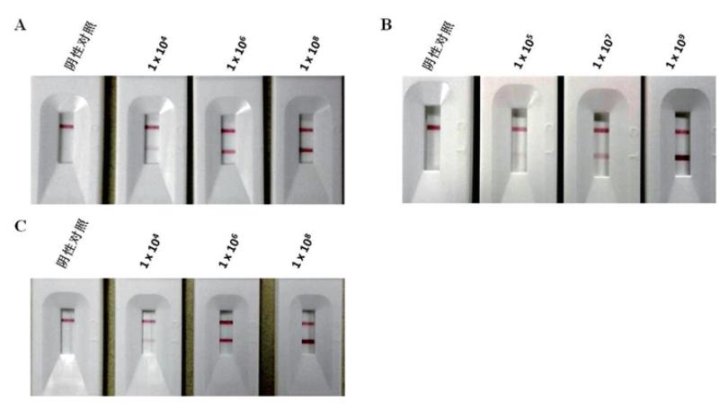用包被和偶聯抗體組裝膠體金測試卡,將01-小川型、O1-稻葉型、O139群霍亂弧菌滅活菌液倍比稀釋,用膠體金試紙條檢測,評價各自的靈敏度。