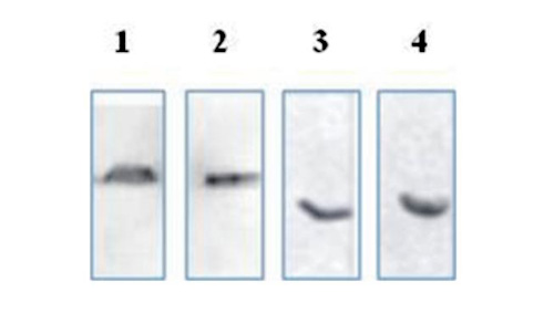 滅活的測試菌菌液經 SDS-PAGE電泳,然后經轉膜、洗膜等處理后,分別加入VC O1-OgawamAb1 , VC O1-Ogawa mAb2 , VC O139mAb1和VC O139 mAb2做為一抗,最后以HRP標記羊抗鼠IgG抗體做二抗進行檢測。檢測結果如圖所示: