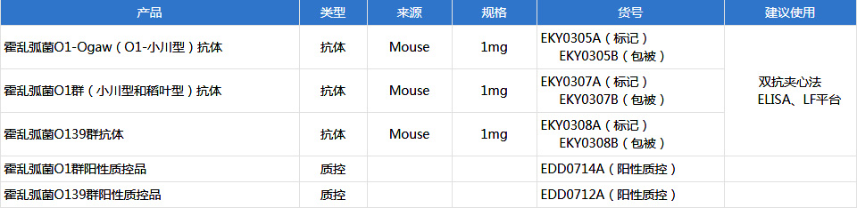 Seebio公司目前研發篩選出的檢測霍亂弧菌單克隆抗體能夠特異性識別01-小川型、01-稻葉型和0139群霍亂弧菌,具有特異性好,靈敏度高等特點,并且適用于各種免疫平臺。這些抗體可用于ELISA、Western-blot、金標試紙等不同用途的免疫學檢測系統的開發。