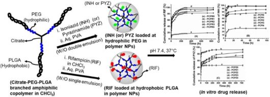 再者利福平 (RIF)、異煙肼 (INH)和吡嗪酰胺(PYZ),基于PLGA- PEG的兩親性支化共聚物納米粒子(NPs) 已開發(fā)用于結(jié)核病 (TB) 藥物的控釋。支化 PLGA-PEG 的共聚物 NP 表現(xiàn)出初始爆發(fā)釋放,隨后持續(xù)釋放 RIF 840 小時、INH 72 小時和 PYZ 720 小時。與線性類似物相比,良好的數(shù)據(jù)讓支化檸檬酸酯-PEG-PLGA 共聚物納米顆粒可作為潛在的藥物載體[10]。