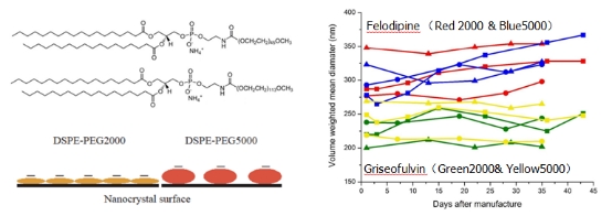 再如,DSPE-PEG2000/5000作為非洛地平和灰黃霉素納米晶體的穩(wěn)定劑進行性質(zhì)對比,結(jié)果表明,DSPE-PEG2000和DSPE-PEG5000是高效的納米晶穩(wěn)定劑,其中DSPE-PEG 2000具有更高的表面覆蓋率和更好的膠體穩(wěn)定性,而DSPE-PEG5000具有更廣泛的結(jié)構(gòu),可能具有延長體內(nèi)循環(huán)時間和促進靶向修飾的優(yōu)勢。