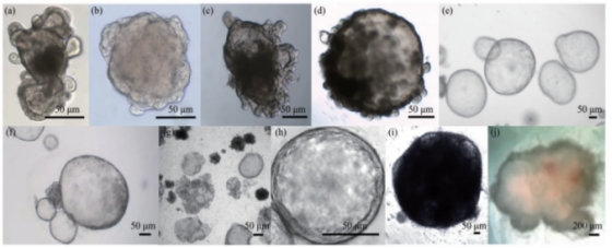 圖注:(a)小腸類器官形貌圖.(b)結腸類器官形貌圖.(c)食管類器官形貌圖.(d)胃類器官形貌圖.(e)肝臟類器官形貌圖.(f) 胰腺類器官形貌圖.(g)肺類器官形貌圖.(h)乳腺類器官形貌圖.(i)腎類器官形貌圖.(j) 腦類器官形貌圖