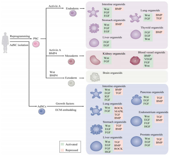 圖2,人PSC來源類器官和ASC來源類器官的形成過程(圖片來源:俞東紅, 曹華, 王心睿, 等. 類器官的研究進展及應用. 生物工程學報, 2021, 37(11): 3961-3974