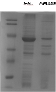 下圖數據為Seebio-21菌在不同培養基中的目標蛋白表達情況,泳道“Seebio”代表培養基中添加Seebio品牌胰蛋白胨+酵母粉,泳道“某進口品牌”代表培養基中添加某進口品牌蛋白胨和酵母粉,通過SDS-PAGE電泳進行結果顯示,Seebio品牌胰蛋白胨+酵母粉組合表達效果優于某進口品牌組合。