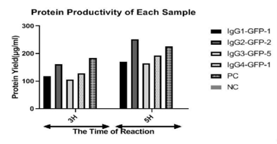 在IgG系列的表達(dá)和純化試驗(yàn)中,檢測 了IgG1、IgG2、IgG3、IgG4和PC的產(chǎn)量分別是117.49,161.35,106.42,128.71和183.45μg/ml;它們在5h的產(chǎn)量分別是170.50,251.77,164.64,192.56和225.54μg/ml。 |