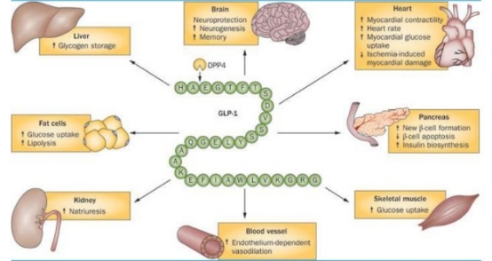 GLP-1受體廣泛分布于全身多個器官和組織,包括中樞神經系統、胃腸道、心血管系統、肝脂肪組織、肌肉等,因此GLP-1RA具有多重降糖機制,如促進胰島素生產和分泌、增加胰島素敏感性、抑制胰高血糖素分泌、抑制β-細胞凋亡、減少肝臟糖輸出、抑制食欲、延緩胃排空和胃腸蠕動。此外,在神經組織中,GLP-1RA可以保護神經細胞、抵抗食欲不振、增強記憶力,而在心血管領域,它有助于提升心血管功能并減少炎癥。因此,GLP-1及其受體激動劑在糖尿病和代謝相關疾病治療中具有廣泛的潛在作用。