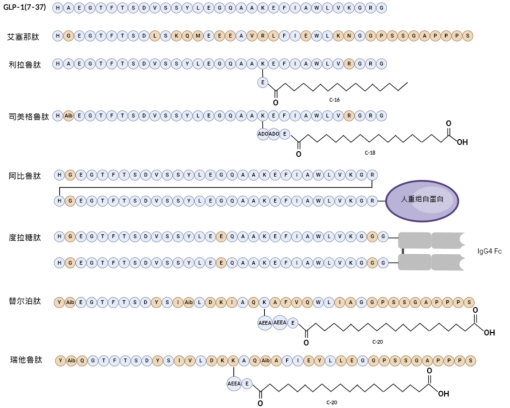 總之,GLP-1類似物的研發經歷了從短效到長效、從注射劑到口服劑、多靶點治療的過程,旨在提高藥物療效和用藥便利性。部分GLP-1RA的序列信息見圖2。