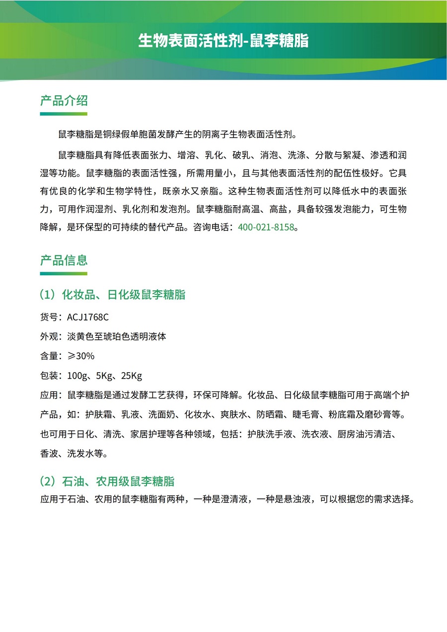 鼠李糖脂具有降低表面張力、增溶、乳化、破乳、消泡、洗滌、分散與絮凝、滲透和潤濕等功能。鼠李糖脂的表面活性強,所需用量小,且與其他表面活性劑的配伍性極好。它具有優良的化學和生物學特性,既親水又親脂。這種生物表面活性劑可以降低水中的表面張力,可用作潤濕劑、乳化劑和發泡劑。鼠李糖脂耐高溫、高鹽,具備較強發泡能力,可生物降解,是環保型的可持續的替代產品。咨詢電話:400-021-8158。