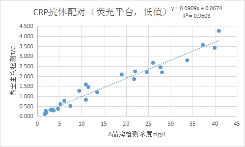 低值部分(≤40mg/L)與A品牌CRP試劑相關性R2>0.95。