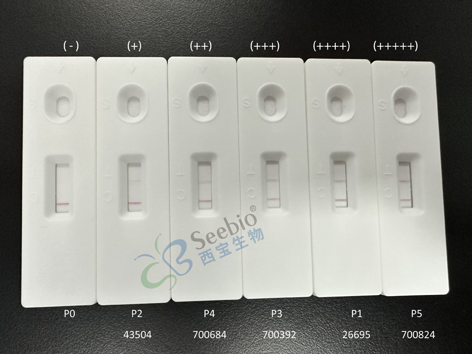實(shí)驗(yàn)結(jié)果:在彩色乳膠免疫層析平臺,采用此抗體配對組合測試稀釋后的P1-P5質(zhì)控均為陽性,表明此抗體配對測試靈敏度良好。