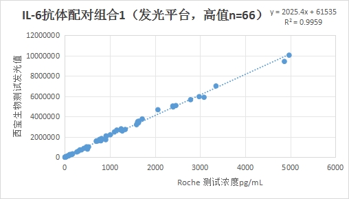 西寶IL-6抗體配對1高值部分(<4000pg/mL)的發光值與Roche IL-6試劑臨床相關性R2>0.95。