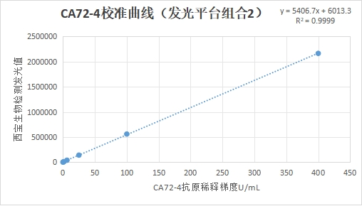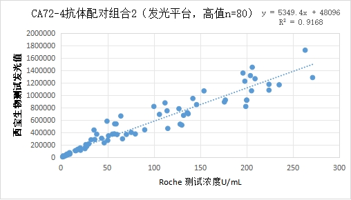 西寶CA72-4抗體配對高值部分(<300U/mL)的發光值與Roche CA72-4試劑臨床相關性R2>0.90。
