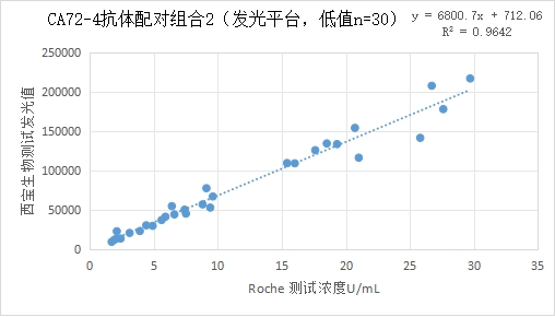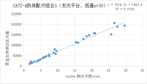 西寶CA72-4抗體配對低值部分(≤30U/mL) 的發光值與Roche CA72-4試劑臨床相關性R2>0.95;