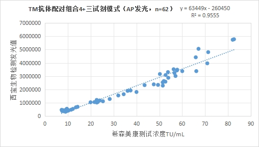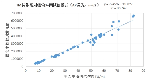 西寶生物發光(AE)平臺TM抗體配對組合2(三試劑模式)與希森美康 TM試劑(化學發光法)賦值的臨床樣本相關性R2>0.95,相關性良好。