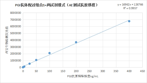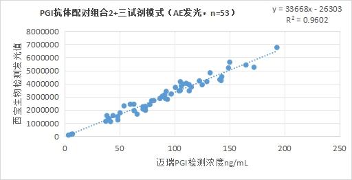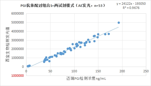 西寶生物發(fā)光(AE)平臺(tái)PGI抗體配對(duì)組合1(兩試劑模式)與邁瑞醫(yī)療PGI試劑(化學(xué)發(fā)光法)賦值的臨床樣本相關(guān)性R2>0.95,相關(guān)性良好;