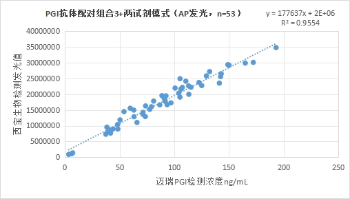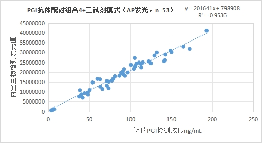 西寶生物發(fā)光(AP)平臺(tái)PGI抗體配對(duì)組合4(三試劑模式)與邁瑞醫(yī)療PGI試劑(化學(xué)發(fā)光法)賦值的臨床樣本相關(guān)性R2>0.95,相關(guān)性良好。