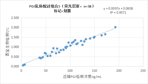 西寶生物熒光平臺(tái)PGI抗體配對(duì)組合5與邁瑞醫(yī)療PGI試劑(化學(xué)發(fā)光法)賦值的臨床樣本相關(guān)性R2>0.95,相關(guān)性良好。