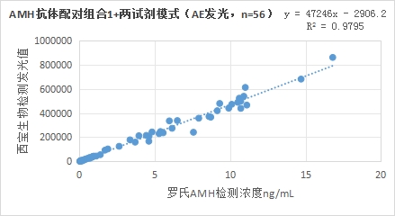 3.1.2西寶生物發光(AE)平臺AMH抗體配對組合2與羅氏診斷的AMH試劑(電化學發光法)賦值的臨床樣本相關性R2>0.95,相關性良好。